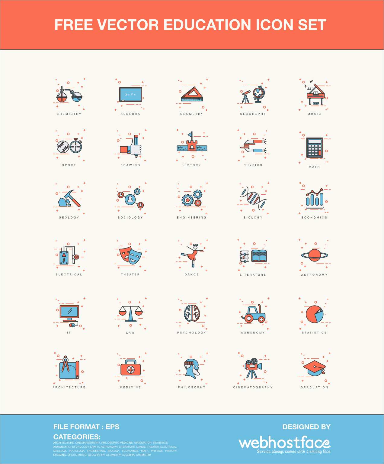 Prepare for the new school year with a vibrant and comprehensive set of 30 free education vector icons, designed entirely by the WebHostFace design team. This collection of icons is perfect for school, college or university websites, online tutorials, academic, artistic or science blogs or any other learning-themed projects.
